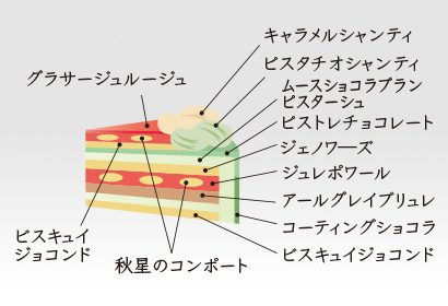 石川県産のりんご「秋星」のコンポートや洋梨のジュレ、アールグレイが香るクリームを中央に忍ばせ、濃厚なピスタチオムースで全体を包み込みました。