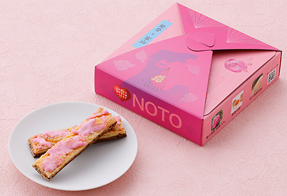 雪吊りの縄に見立てたミルフィーユに能登産の卵、石川県産の米粉を使用したカカオのサブレを重ねました。
